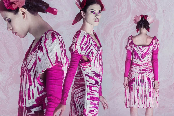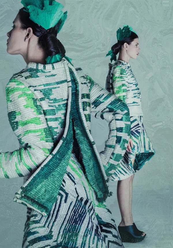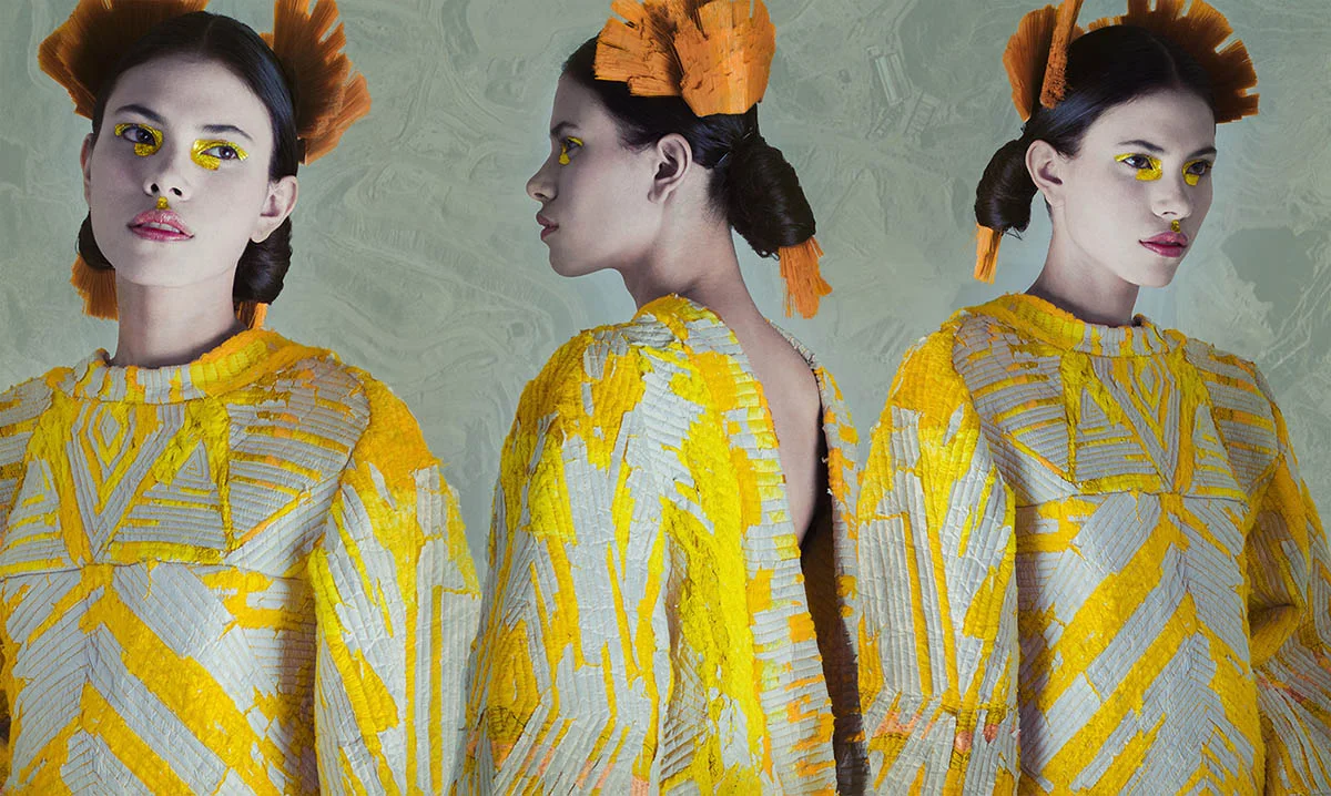 This Colombian designer's work totally caught my eye. Not only is it rich in method, texture and color, but has a powerful background story as well. The collection is called "Potosi" named after the richest silver mine on earth (located in Bolivia). The colorful torn strips of paper running through each piece are meant to recall the destructive paths that are made to the land when mining the silver. He says "In the garments those scars are the ripped paper...I home-dyed over 40 colors of a textile cotton waste and used PET to generate the headpieces."