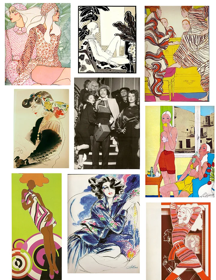 Antonio was the name in fashion illustration throughout the 70s-80s. I love his range of styles and attention to detail of fabrics and color. He was often called the "Pied Piper of Fashion" with his own flair for style—befriending models and helping to launch the careers of Jerry Hall, Grace Jones and Jessica Lange. His work appeared on the pages of numerous publications including Vogue, Vanity Fair and Interview to name a few. A recent revival of some of his artwork can be seen in a 2013 MAC makeup campaign celebrating his creations.