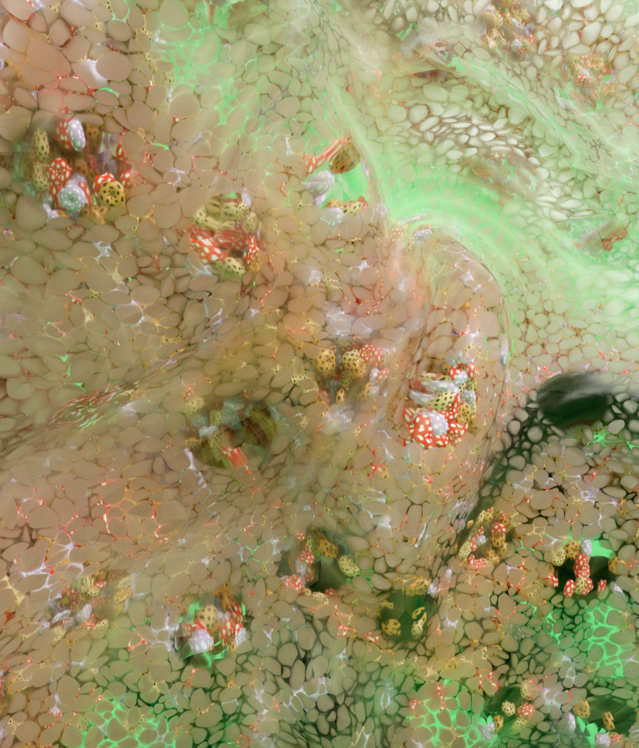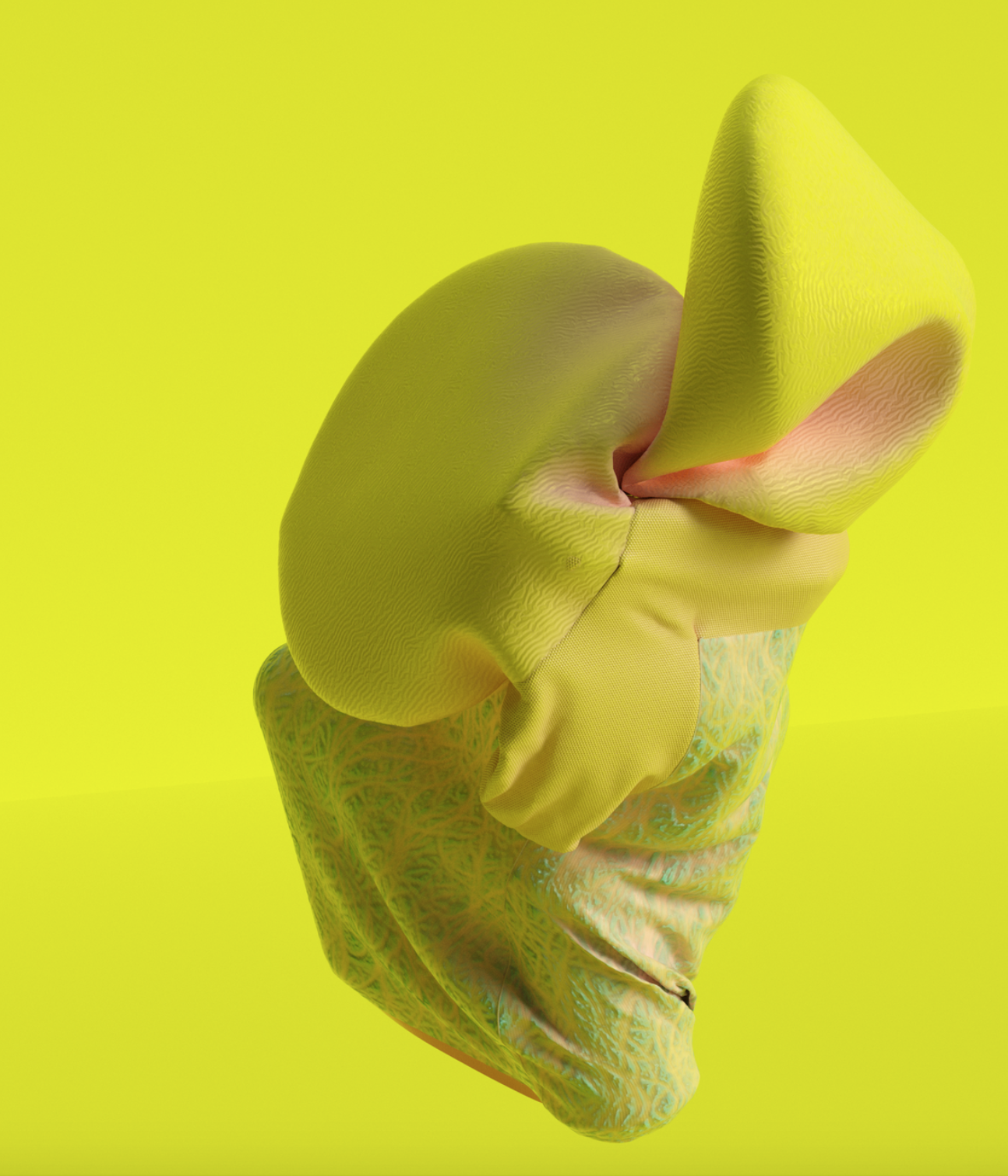 Part dreamlike theatre, part lateral cargo cult hustle, a quick succession of bold garment designs acts as an ersatz runway show. In a minimal set of solid backdrops, radiant colors and oblique choreography second the exquisite design of costumes that have been entirely artificially generated.
